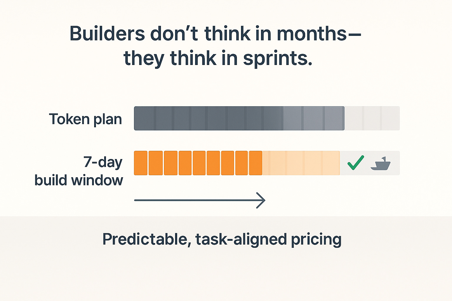 A maioria das plataformas vende planos mensais com limite de tokens. A maioria dos times não constrói o mês inteiro. Inscrevem, codam forte por 5–10 dias, entregam demo, exportam para um assistente de código (Cursor, Claude Code, etc.) e param. O usuário não quer “calendário” - quer uma forma previsível de pagar por um bloco de trabalho.